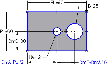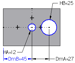 在尺寸间创建表达式时,如果两个尺寸都在同一个草图或轮廓中,不能使用从动尺寸来确定驱动尺寸的值。例如,如果所显示的除料特征的轮廓圆 HA 和 HB 在同一个轮廓平面或草图平面上,则不能使用 DmA 控制 DmB 的值,因为 DmA 是从动尺寸。(DmA 是被驱动尺寸,因为轮廓圆 HA 的位置是由零件边中点间的几何关系控制的)。