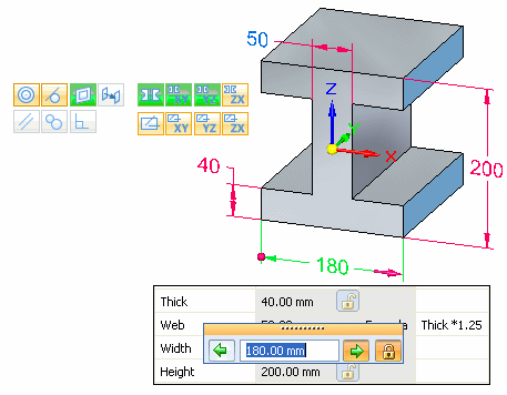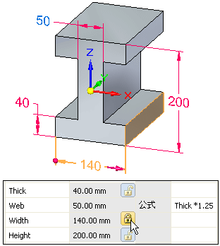 可以在图形窗口中或变量表中显示并选择尺寸变量。可以使用尺寸变量控制和编辑设计。