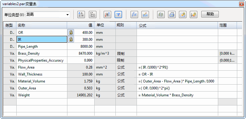 可以使用变量表中的“公式”列创建表达式(公式)来控制变量。表达式可以只由变量组成,也可以由包含软件放置的任何常量、用户定义变量或尺寸变量的任意组合的数学表达式组成。