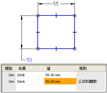 发生这种情况时,不会违反规则,但该变量的“值”单元格的颜色会变为橙色,这表示存在冲突。例如,您可以定义一个简单的公式,说明 DimA=DimB。DimA 的尺寸文本颜色发生变化表示其尺寸值是由另外一个尺寸控制的。变量表中的尺寸的“值”单元格变为灰色,这表明其值是由另外一个变量控制的。