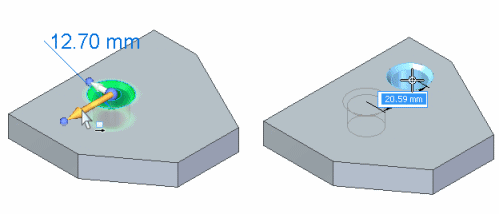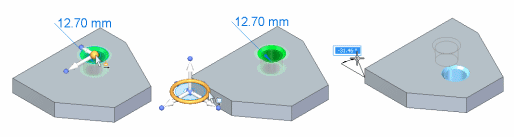 选择圆柱特征(如孔)时,会显示 2D 方向盘。单击 2D 方向盘上的原点把手时,会显示方向盘。