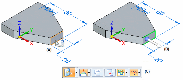 在设置“倾斜相连面”选项之后,将根据需要对相邻面 (A) 进行延伸或修剪,但也可将它们的角度方位更改到选定面。同时请注意,不可更改选定面的大小。