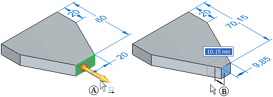 主轴通常用于移动平的几何体,如单个平的面或参考平面。选择平的面时,仅显示方向盘及其主轴 (A)。主轴方向与选定面垂直。您可以单击主轴箭头 (A) 来沿主轴移动选定的面 (B)。相邻的面自动更新其位置,任何受移动操作影响的已解锁尺寸同时也更新。
