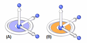 方向盘和 2D 方向盘的显示将有所不同,具体取决于您的选择。这种显示变化称为逐渐显露。例如,在零件文档 (A) 中选择单个平面时,仅会显示方向盘的主轴和原点把手 (B)。