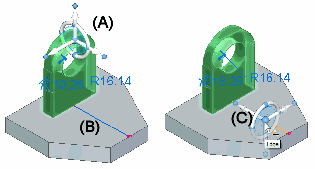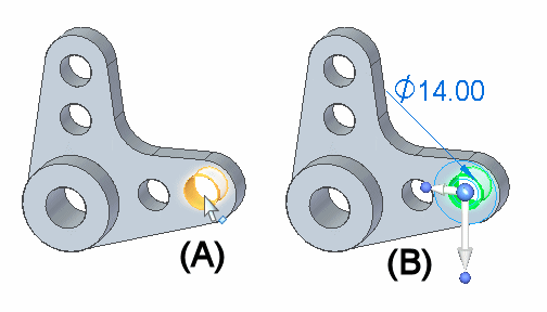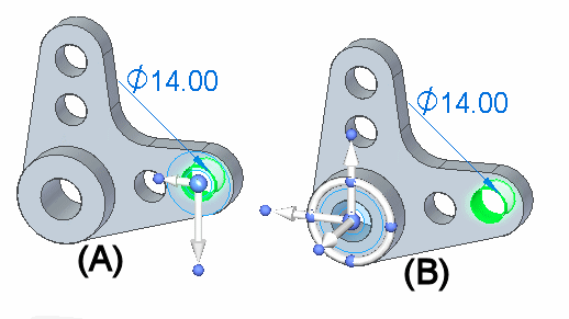您可以相对于圆柱面、圆柱边、线性模型边或线性草图元素定位方向盘主轴,从而定义旋转轴。例如,在孔 (A) 上选择圆柱面时,默认情况下会显示 2D 方向盘,并且定位在您选定的孔面 (B)。