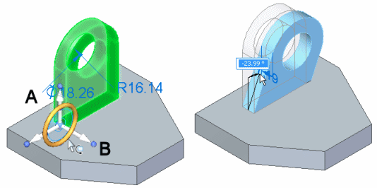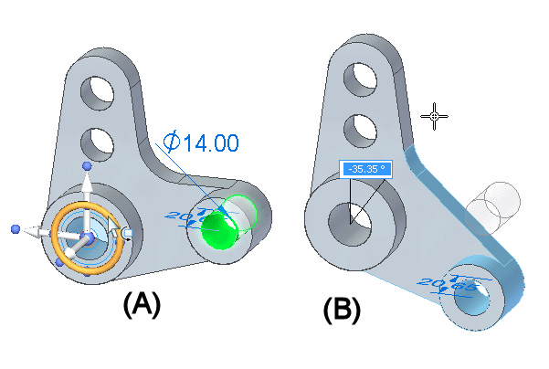 您然后可以单击圆环 (A),并将选定的孔旋转所需的角度距离 (B)。您也可以使用动态输入框来键入一个精确的旋转角度。