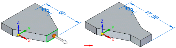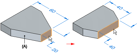 设置了“延伸/修剪相连面”选项后,将根据需要对相邻面 (A) 进行延伸或修剪,但将维持其原始方位。同时请注意,可以更改选定面的大小。