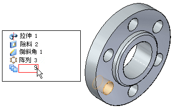 在同步模型中,“打孔”、“矩形阵列”、“圆形阵列”和“沿曲线进行阵列”命令创建了特征集。