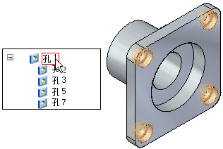 当您高亮显示或选择集内的某一特征实例时,该特征实例将处于高亮显示或选中状态。由于其为集的一部分,因此如果您编辑了集内一个孔的参数,则集的所有成员都将被修改。