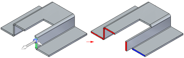 在以下示例中,对称和厚度链已禁用。当选定的面移动时,红色的面也移动,因为它们是共面的而且属于一个单独的厚度链。由于“厚度链”已禁用,并且在包含要移动的选定面的厚度链中未检测到“共面”规则,所以蓝色面不移动。