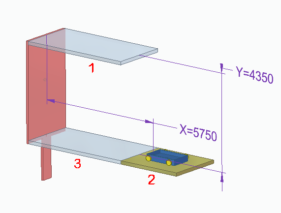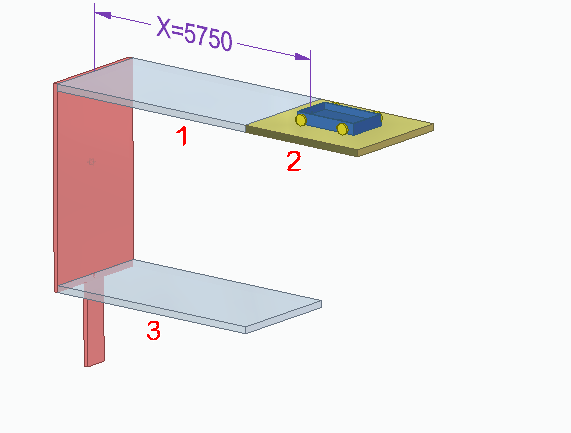 零件 2 将下降到零件 3 这一层,小车也随之下降。发生这种情况是因为当电动机变量达到变量表公式中的条件时,与零件 1 之间的贴合关系被抑制,和零件 2 之间的贴合关系被取消抑制。