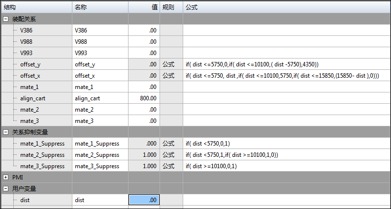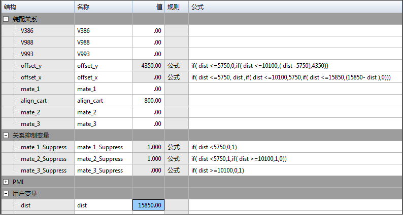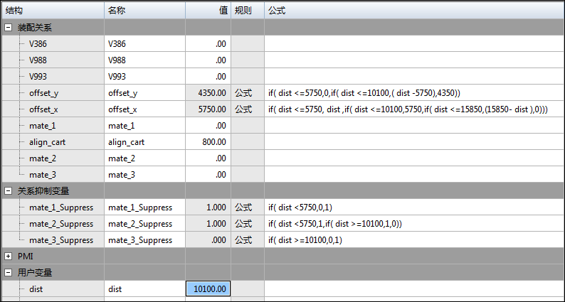 由于变量 dist 按变量表电动机递增,公式控制抑制变量的行为和移动零件所需的偏置。IF 条件语句,类似于在 Excel 中发现的那些语句,用于控制抑制变量。