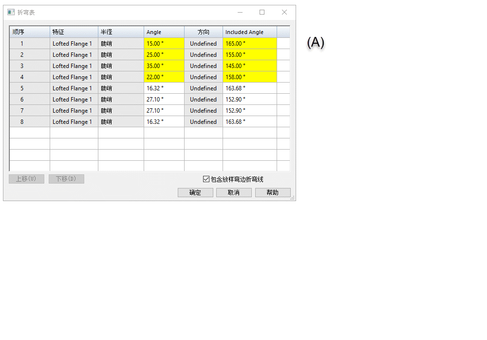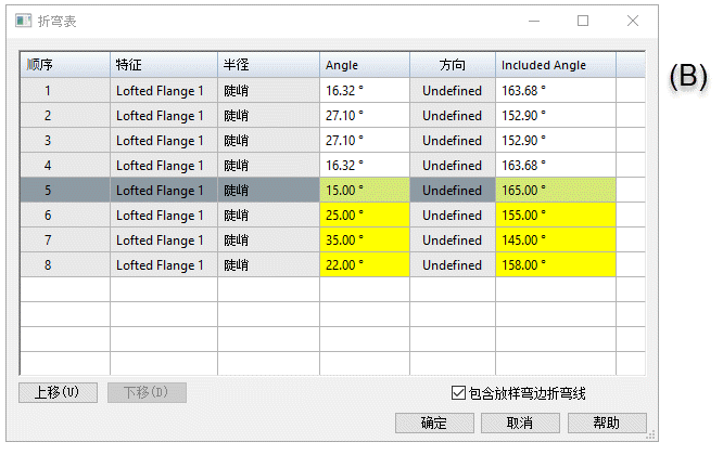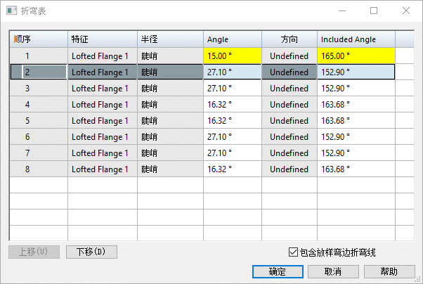 可使用折弯表对话框中的上移和下移按钮更改折弯序列。