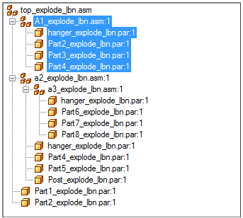 如果您选择该装配结构的核心列表(所有零件和子装配)零件明细表,数量覆盖在 A1_explode_lbn.asm 中的部件级别显示。