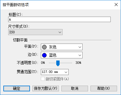 如果您单击该对话框中的“另存为默认值”按钮,则这些切割平面选项 -“平面”、“边”、“透明度”、“贯通范围”、“剖切紧固件”- 可以保存为默认的剖面注释设置。