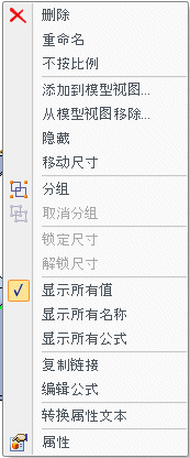 如果指向“尺寸”或“注释”节点时选择“隐藏”,则集合中的所有尺寸和注释会立刻关闭显示。