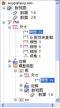 在“装配路径查找器”或“特征路径查找器”中,扩展 PMI 集下的“尺寸”或“注释”列表。