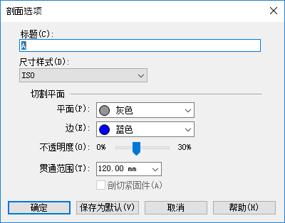 如果您单击该对话框中的另存为默认值按钮,则这些切割平面选项 -“平面”、“边”、“透明度”、“贯通范围”、“剖切紧固件”- 可以保存为默认的剖面注释设置。