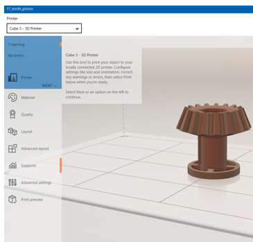 此外还需确认有无警告或需要修复的错误。这些警告或错误会在 3D 打印机列表下的窗格中列出。