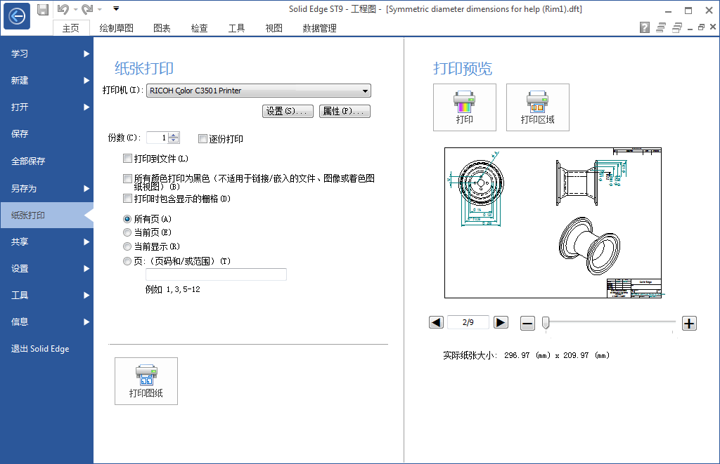 通过对零件、钣金或装配文档进行打印预览,可显示模型的静态视图。工程图文档显示图纸的实时预览以及缩放、滚动和图纸页控件。