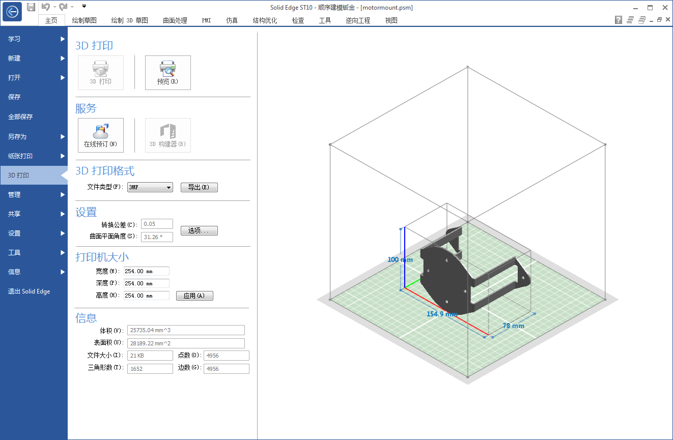 右窗格中的预览在绿色打印机床上居中显示模型。如果模型大于任意方向上设置的打印机大小,则打印体积将调整为模型的大小。如果计算机上没有安装 3D 打印机驱动程序,则显示的信息用于样本打印机。