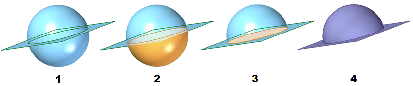 在此示例中,相交命令用于标识要丢弃的曲面的区域。球曲面和顶部平的曲面是选定 (1)。球的底部区域是删除 (2),以及圆形区域的平的曲面 (3) 在球的交点处和平的曲面。这两个曲面现在具有允许它们缝合在一起 (4) 的边界条件。