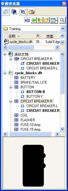 cycle_blocks.dft 文件由表示电池、制动器、保险丝、灯和其他部件的各个块组成。 单击块名称并将其拖放到图纸中,可以将块放入图纸中。 放置块之后,其名称还显示在活动文档列表中,并在左侧显示一个事例指示符符号。 |