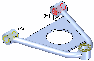示例:向在分析期间移动受约束的面施加固定约束。这些面通常是用紧固件或螺栓连接到物理装配中其他部件上的面,例如面 (A) 和 (B)。