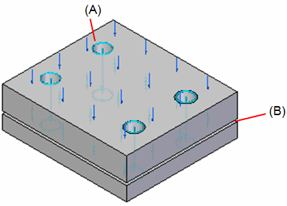 示例:在螺栓孔 (A) 处使用螺栓连接件,同时使用无渗透接触连接件防止渗透两块板 (B)。
