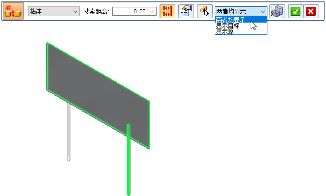 创建和编辑连接件时,可以使用命令条上的可见性选项列表来查看每个接触对中的相连面。对于当前选定的连接件对,它将高亮显示并显示目标面(红色高亮显示)、源面(蓝色高亮显示)或两个面(绿色高亮显示)。
