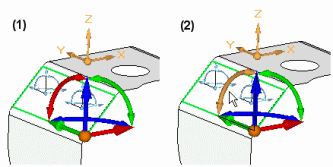如果还选中了“包含旋转 DOF”选项,则也会约束绕两个轴的旋转自由度,后者导致旋转超出曲面。 |