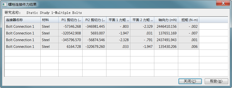 此时将显示螺栓连接件力结果表。因为用过多个螺栓选项来创建螺栓连接,该表将连接件名称列中的所有螺栓都标识为螺栓连接 1,但它会报告每个模拟的螺栓连接的唯一应力。