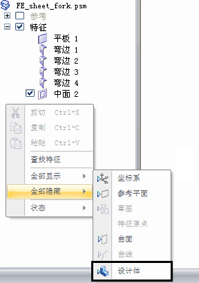 使用钣金模型 (.psm) 时,必须选择现有中面特征。如果不存在中面特征,可以使用仿真选项卡上的中面命令
