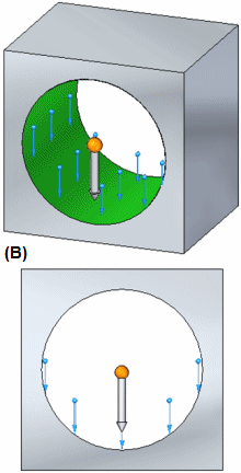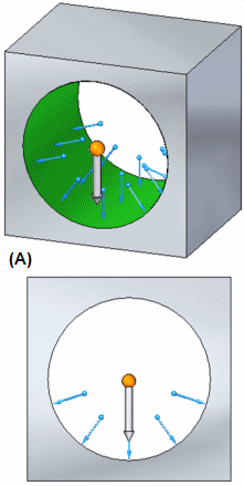 载荷角度 - 载荷角度(与载荷值和曲面法向结合)可确定承压与给定曲面接触的区域。承压载荷符号仅显示在接触区域上。使用动态输入框输入 1E-015 到 180 度之间的值。