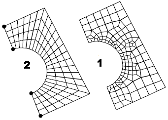 该选项将在曲面上被选为网格拐角的 4 点之间创建已映射网格。可以按任意顺序指定这些点,但必须选择 4 个不同的点。网格的边是所选点之间的全部曲线。请参见上图中的 2。