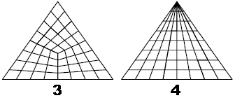类似于已映射四角选项,但该选项定义的是 3 个拐角位置,而不是 4 个拐角位置。生成的网格可以是三角曲面上的任意四边形网格。不过根据几何体,生成的网格可能会严重地翘曲。请参见下图中的 3。