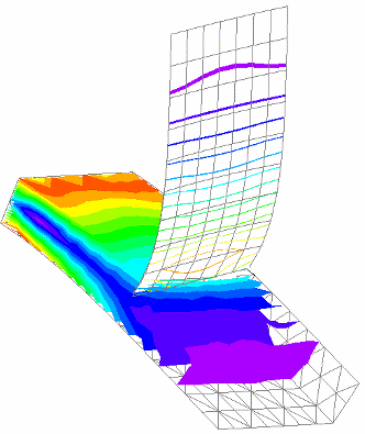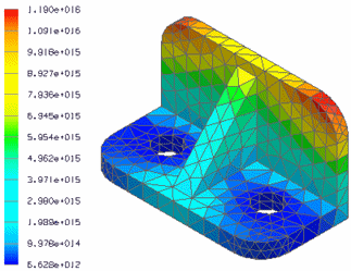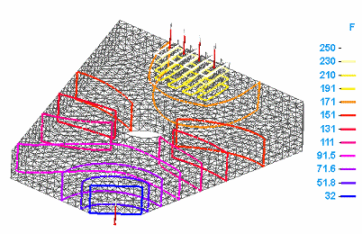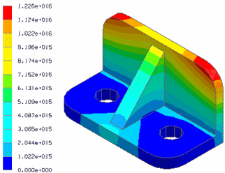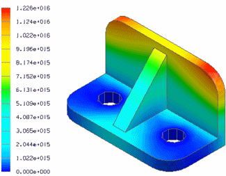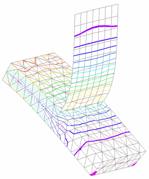 等值线 - 在您选择“等值云图”命令时,系统默认显示等值线。等值线有助于理解模型曲面上结果值的分布。您可以在实体模型上显示等值线,也可以在具有由曲面网格进行网格划分的板的模型上显示等值线。