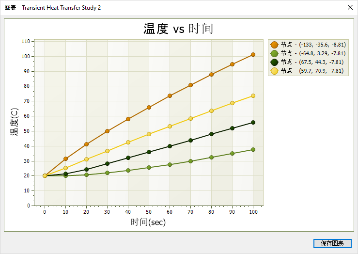 此图表显示了瞬态热研究的选定的节点数据。
