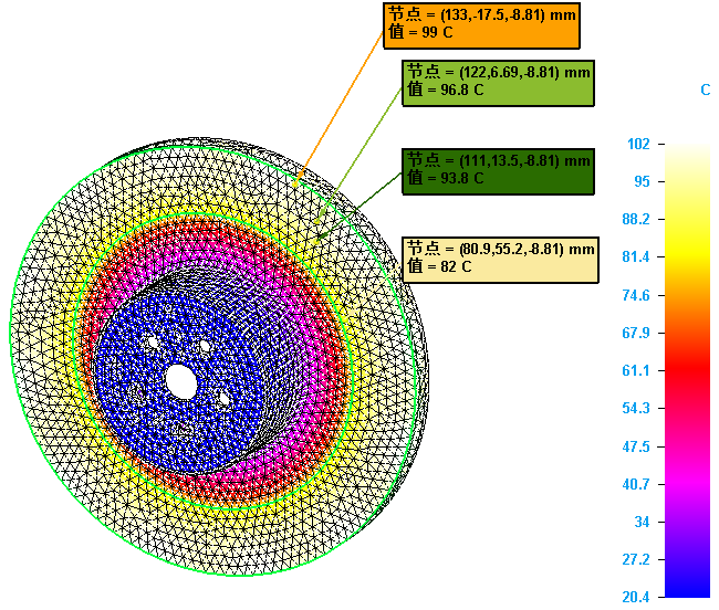 节点数据标签在白色背景的框形标注中显示数字分析结果。这使数据容易读取,尤其是叠加在经过梯度着色的黑色模型背景或窗口上时。可以更改模型上节点的默认显示颜色,方法是更改仿真选项卡(创物3D 选项对话框)上的节点颜色设置。