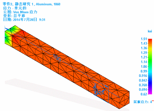 在“仿真结果”环境中,彩色云图显示模型如何对分析参数作出反应。还会标识模型名称、材料名称、分析类型、显示格式以及处理研究的日期和时间。