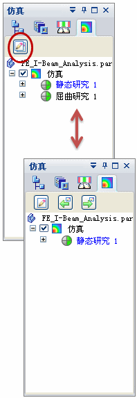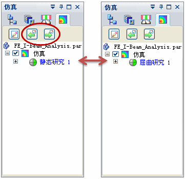可以使用仿真窗格上的按钮查找、查看和修改研究定义。还可以仅使用快捷命令创建、处理和查看分析研究。