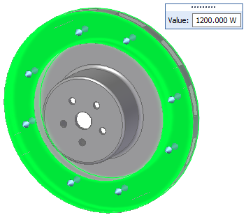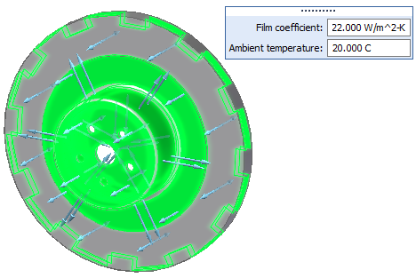 将对流载荷施加于刹车盘的所有表面(刹车片表面除外)。指派自然对流的对流传热系数值 22.000 W/m^2-K 和环境温度 20.000 C。