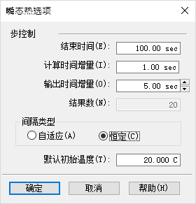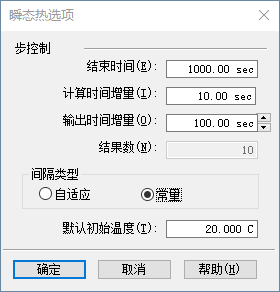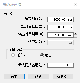 计算时间增量 - 指定系统计算热结果的频率。使用足够小的值,以确保结果在时间步间隔内为线性。该值必须大于零且小于结束时间。可以最初使用默认值,然后根据结果进行调整。