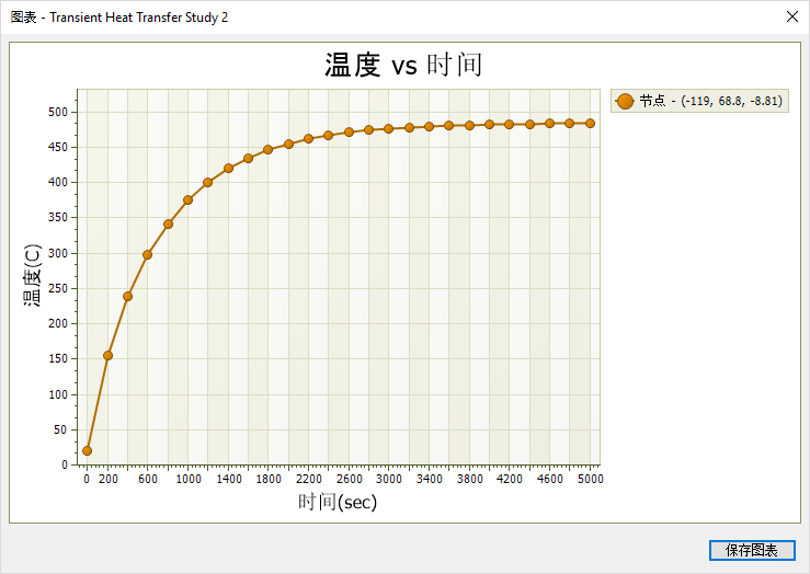 将研究长度增加到 5000 秒后,图形现在显示温度值发生变化的时间增量以及何时达到稳态温度。可以更改时间增量值以更改结果计算频率和结果输出频率。