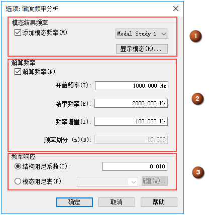 在选项: 谐波频率分析对话框中,将函数应用于研究。从模态阻尼表列表中选择新创建的函数 1。