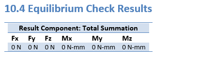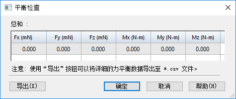 平衡检查将计算仿真研究几何体的力 (Fx,Fy,Fz) 和力矩 (Mx,My,Mz) 的总和。