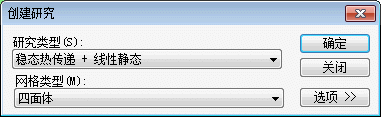 从研究类型列表中,选择稳态热传递 + 线性静态,然后从网格类型列表中,选择四面体。