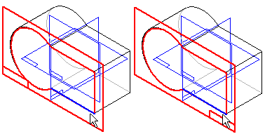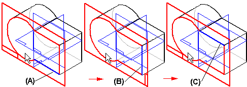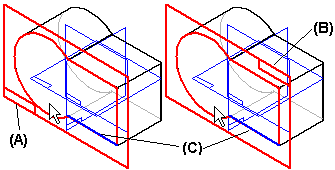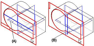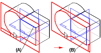 使用大写字母或小写字母 P 来表示与正在定义的参考平面相交的基本参考平面。当按下 P 键时,软件自动从相交的基本参考平面中选择一个参考平面(A)。如果想要使用其他基本参考平面,请再按一次键 P(B)。此方法的优点是能够保持 X 轴方向不变。(P 选项在“装配”环境中不可用。)