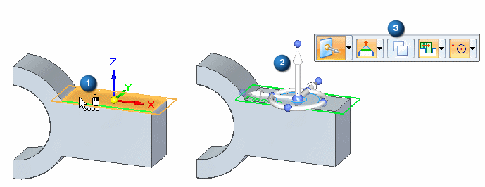 在创建新的重合参考平面后,方向盘 (2) 和移动命令条 (3) 会显示在新的参考平面上,以便将该参考平面移动到新位置。