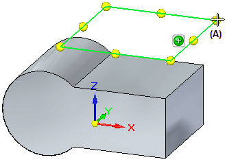 可以通过拖动位于参考平面终点和中点的参考平面手柄 (A) 来动态编辑全局参考平面的大小。要显示全局参考平面的手柄,在选择全局参考平面时单击命令条上的调整大小命令。